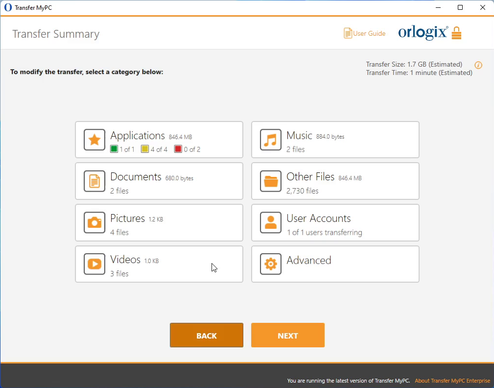 - All applications that can be transferred are selected by default. If desired, you may deselect specific applications that you don't want transferred to the "New PC". See Applications for further instructions.